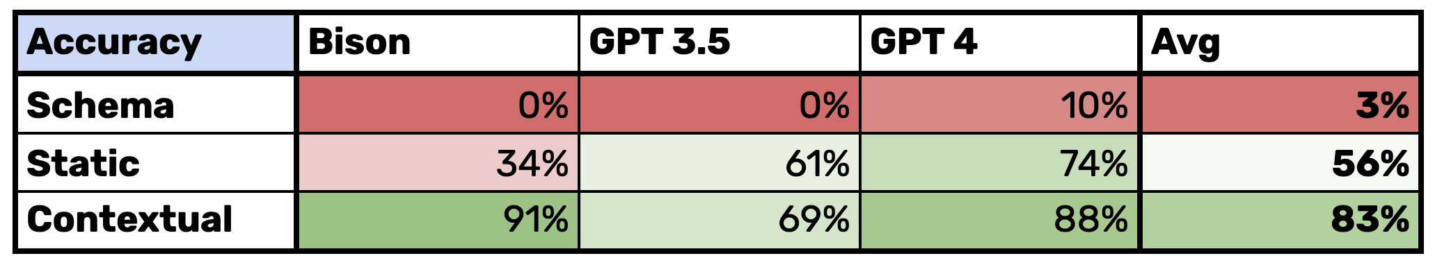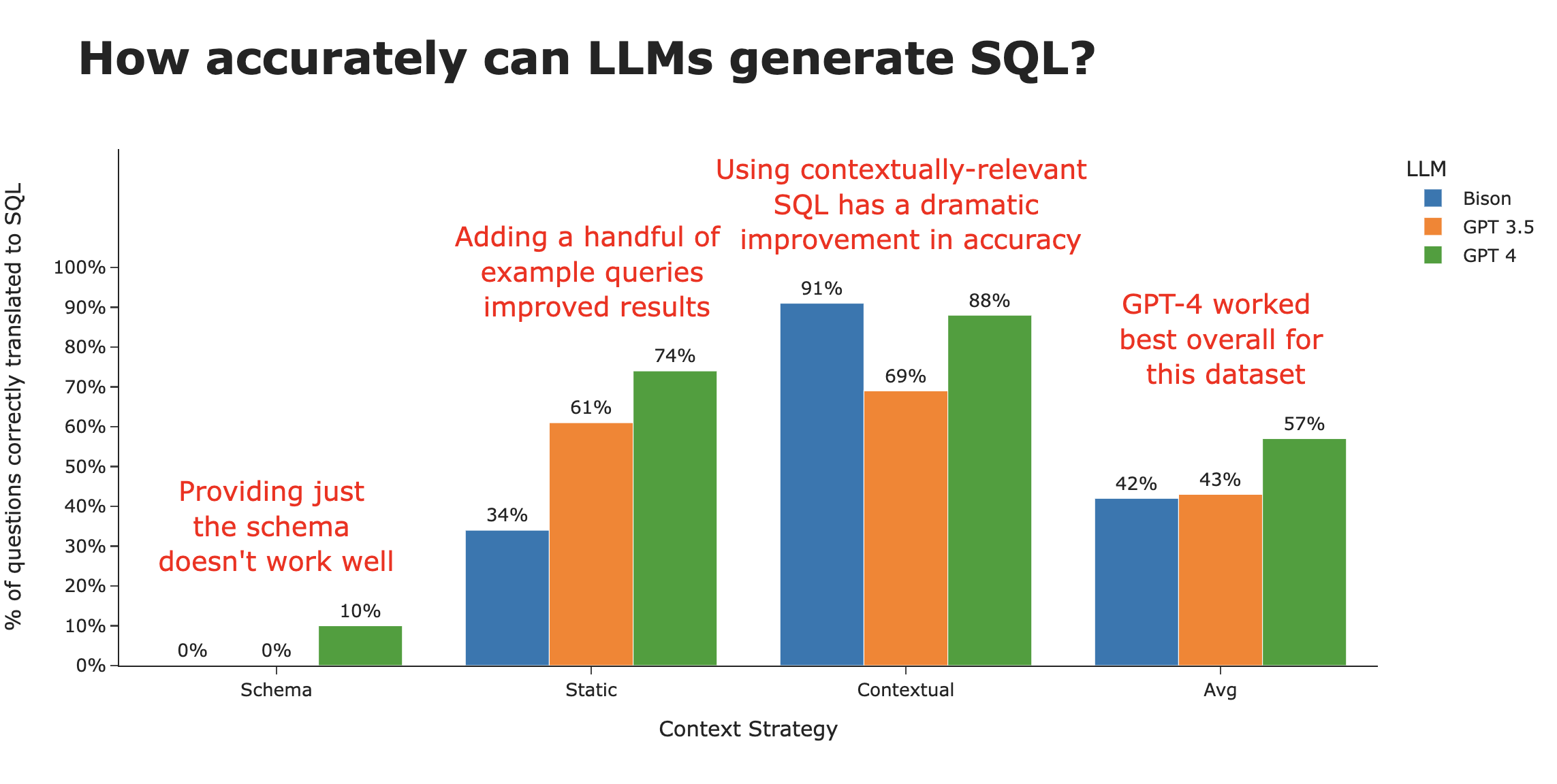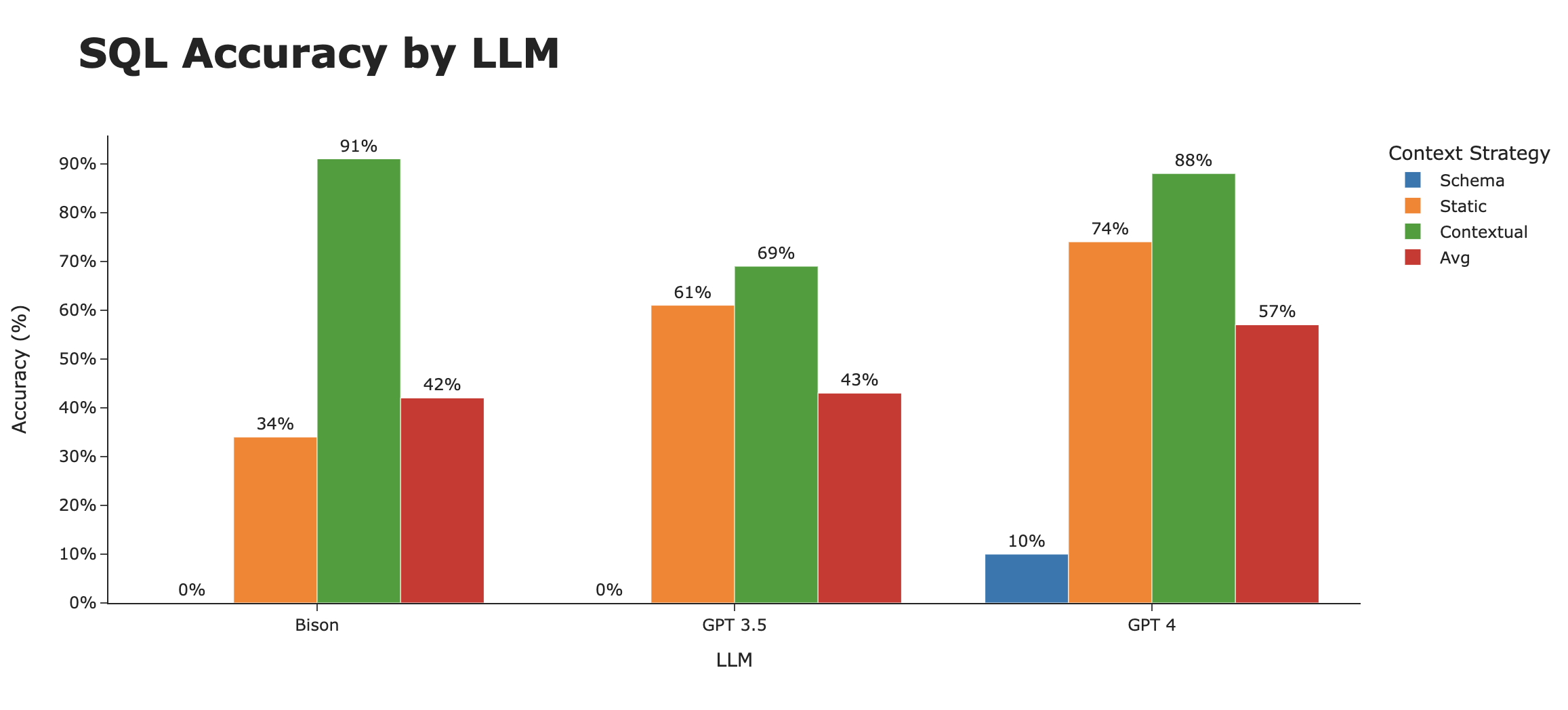 There are still interesting trends with the LLMs themselves. While Bison starts out at the bottom of the heap in both the Schema and Static context strategies, it rockets to the top with a full Contextual strategy. Averaged across the three strategies, GPT 4 takes the crown as the best LLM for SQL generation .