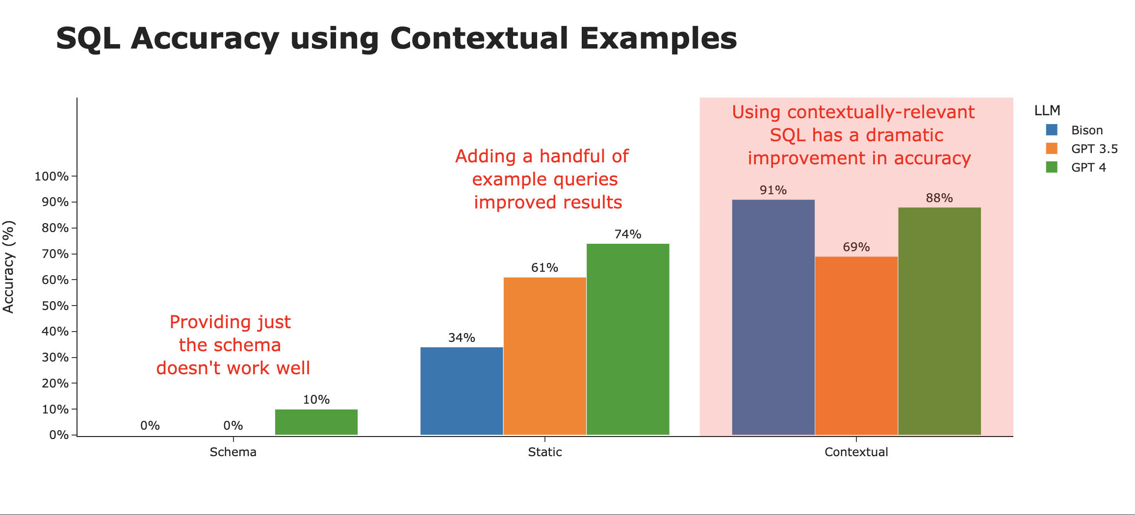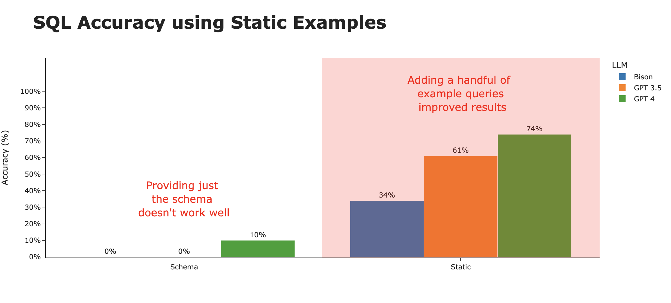 By providing just those 3 example queries, we see substantial improvements to the correctness of the SQL generated. However, this accuracy greatly varies by the underlying LLM. It seems that GPT-4 is the most able to generalize the example queries in a way that generates the most accurate SQL.