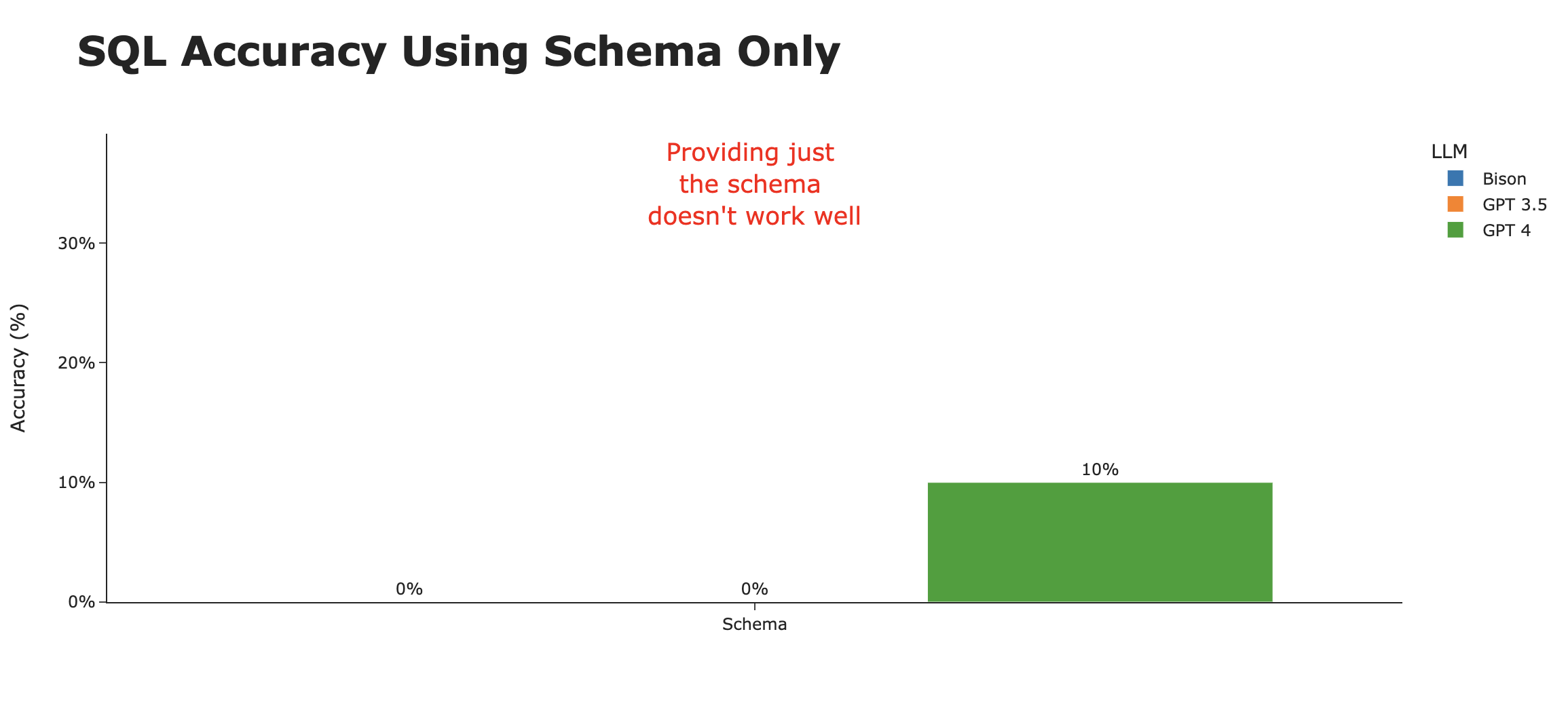 But there’s hope! We’ve spent the last few months immersed in this problem, trying various models, techniques and approaches to improve the accuracy of SQL generated by LLMs. In this paper, we show the performance of various LLMs and how the strategy of providing contextually relevant correct SQL to the LLM can allow the LLM to achieve extremely high accuracy .