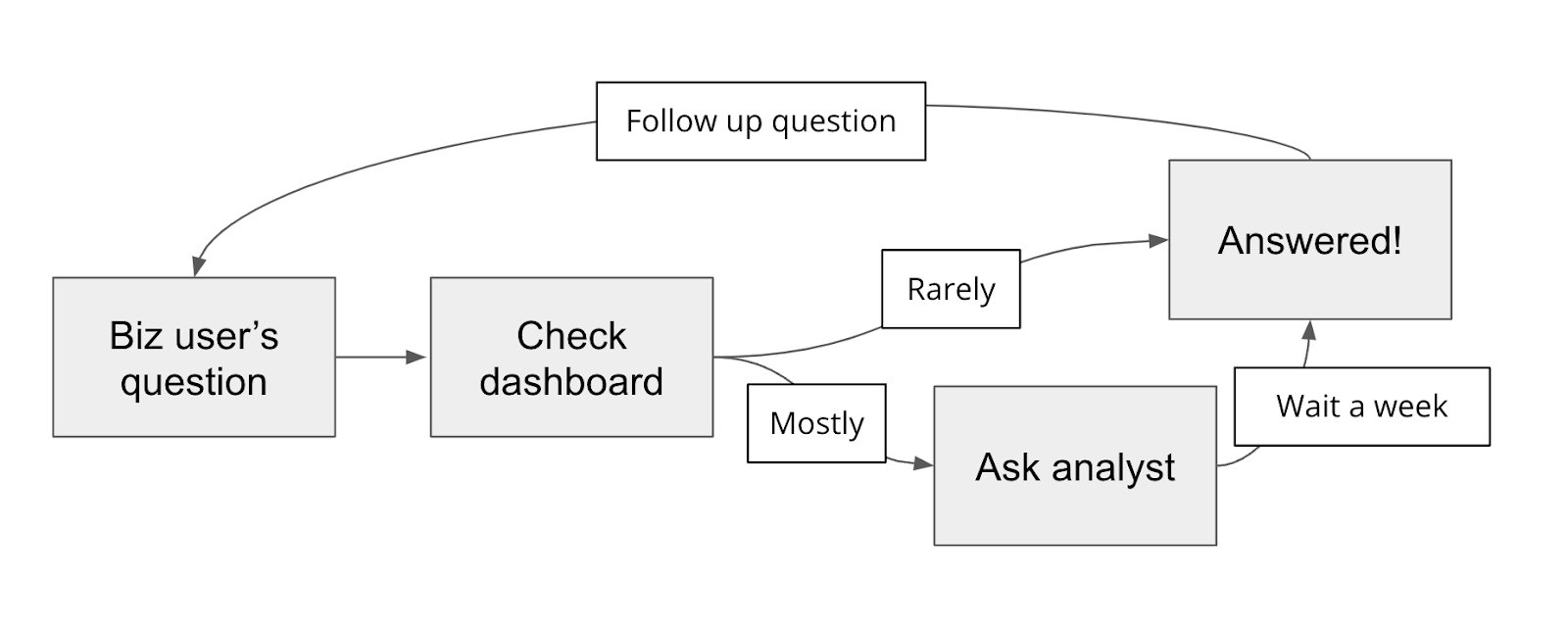 So what actually happens inside organizations? Business users, like product managers, sales managers, and executives, have data questions that will inform business decisions and strategy. They’ll first check dashboards, but most questions are ad hoc and specific, and the answers aren’t available, so they’ll ask a data analyst or engineer - whomever possesses the combination of skills above. These people are busy, and take a while to get to the request, and as soon as they get an answer, the business user has follow up questions.