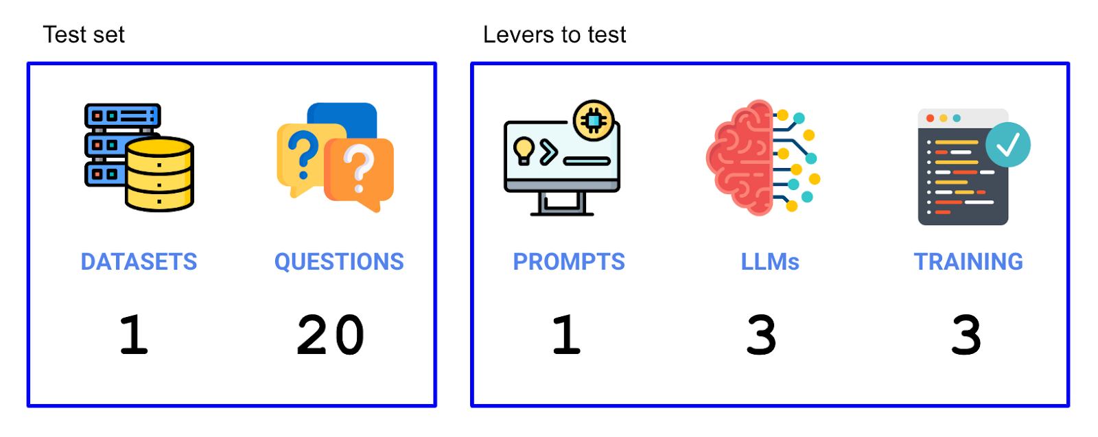 Now that we have our experiment set up, we’ll need to figure out what levers would impact accuracy, and what our test set would be. We tried two levers (the LLMs and the training data used), and we ran on 20 questions that made up our test set. So we ran a total of 3 LLMs x 3 context strategies x 20 questions = 180 individual trials in this experiment.