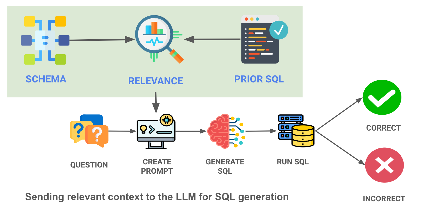 Enterprise data warehouses often contain 100s (or even 1000s) of tables, and an order of magnitude more queries that cover all the use cases within their organizations. Given the limited size of the context windows of modern LLMs, we can’t just shove all the prior queries and schema definitions into the prompt.